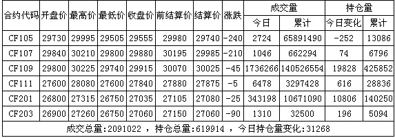 2011-4-13注:1、成交量、持倉量:手(按雙邊計算);2、漲跌:今結算價與前結算價之差;3、成交量:盤面成交量與期轉現量之和。4月12日,周一紐期下試回升,影響今日鄭棉CF1109合約小幅低開,盤中反復震蕩并伴隨大量增倉,午后重心抬高,尾盤受到短線平倉盤壓力下滑,日線形成陽線星,日內成交量變化不大,持倉量大幅增...[繼續閱讀] -