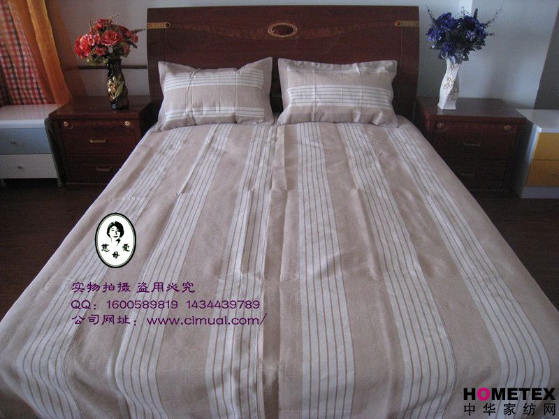 慈母愛涼席綠色天然、環(huán)保健康、主要原料是100%純棉線制成;不褪色、不易搓起、不起球、不卷邊;柔軟舒適,透氣吸汗,適用于貼身使用;吸附人體皮膚上的汗水和微汗,使體溫迅速恢復(fù)正常;鋪在床上高雅大方,現(xiàn)代時(shí)尚。